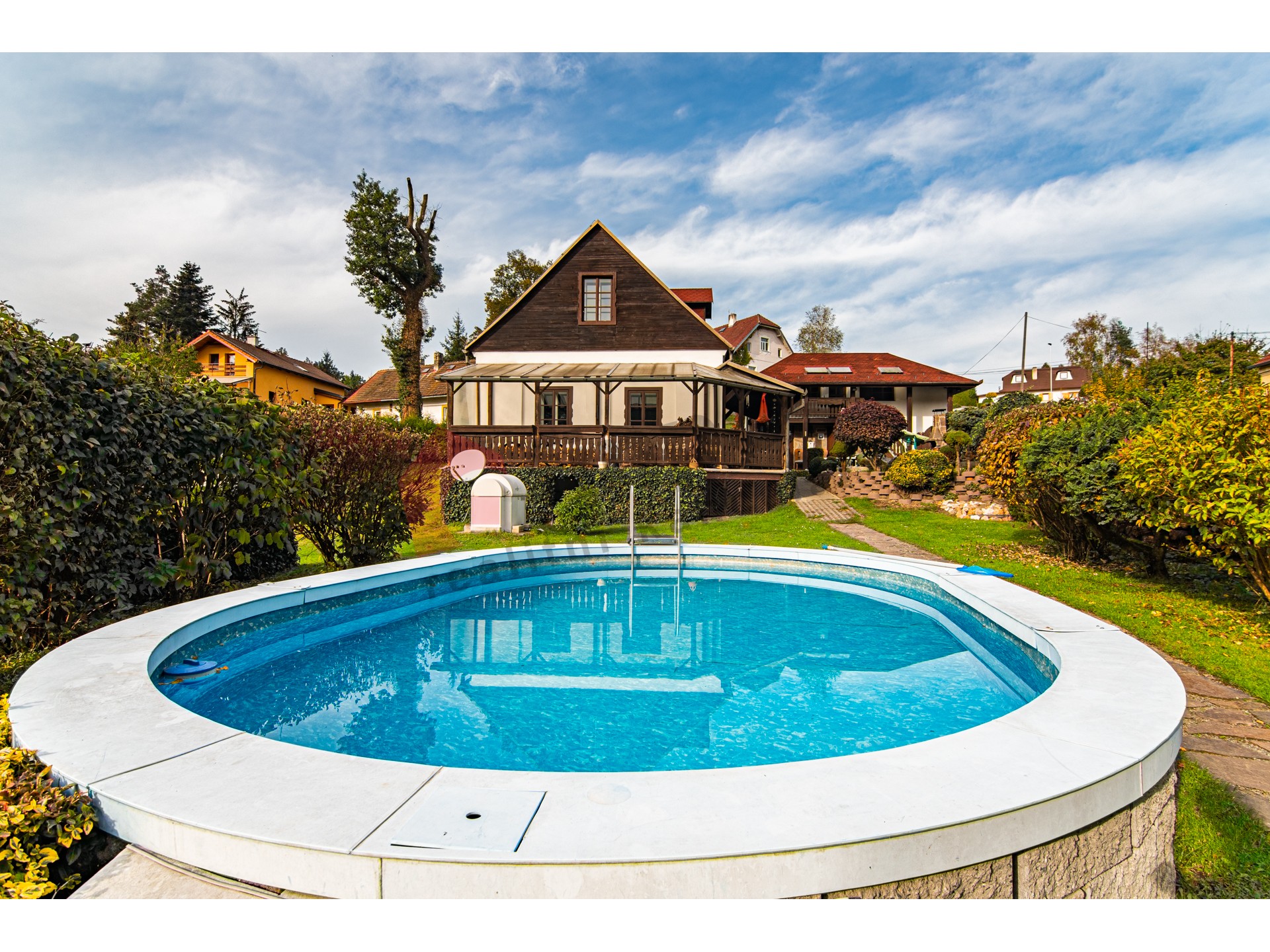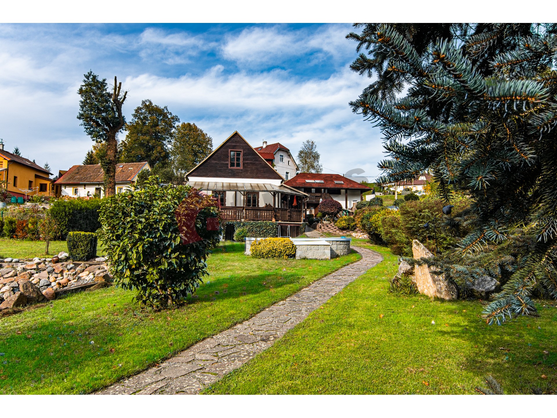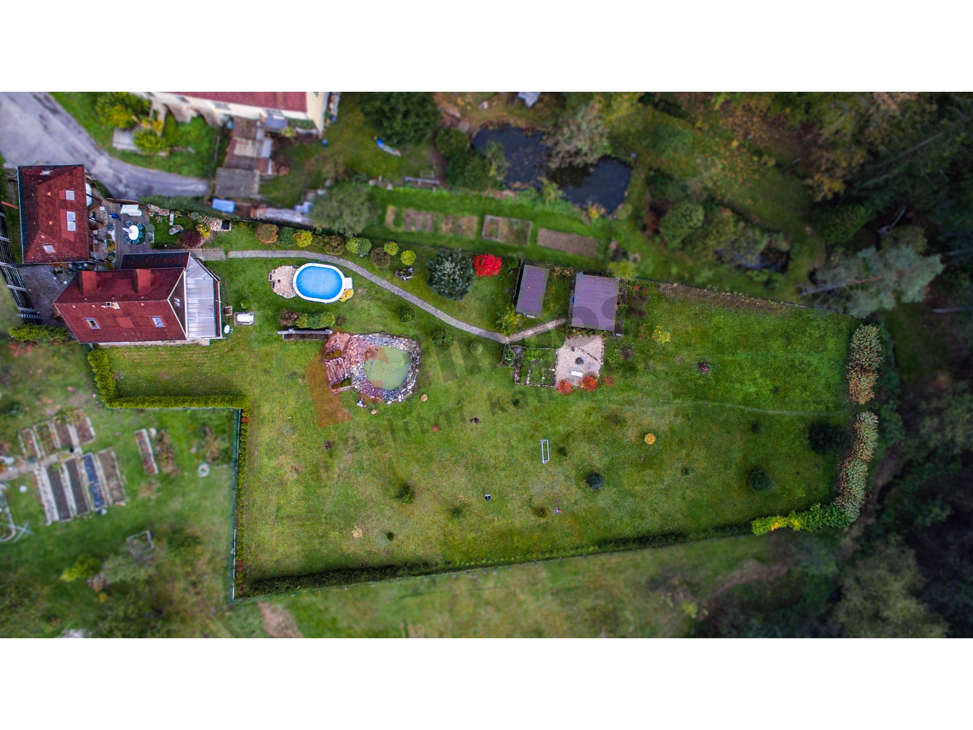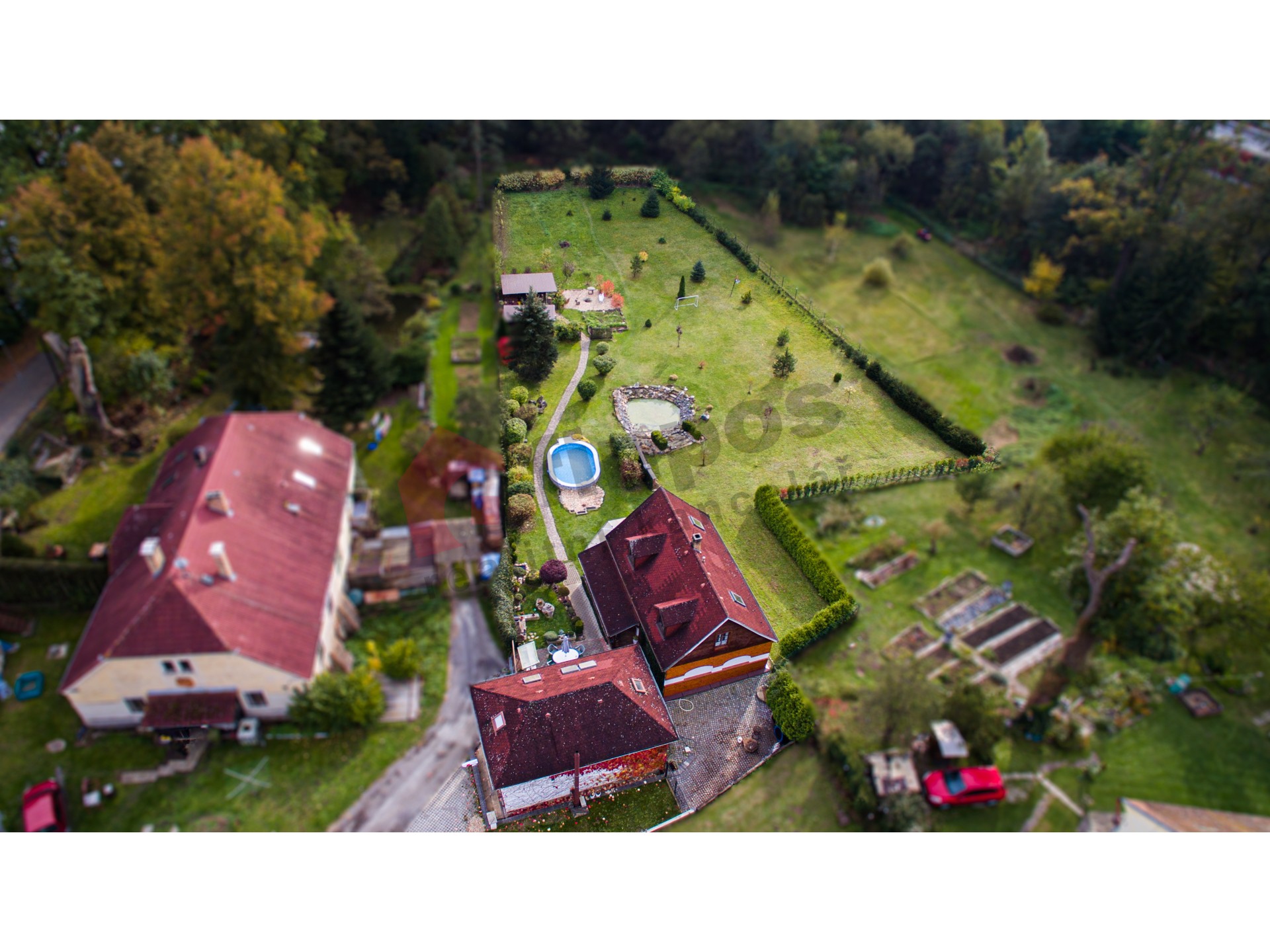 Pozemky náležející k nemovitosti mají celkovou rozlohu 3196 m2. Hlavní rodinný dům s dispozicí 3+1 s obytnou plochou 170 m2, k němuž byl v rámci rekonstrukce v r. 1997 přistaven další samostatný obytný objekt 1+1 s obytnou plochou 98,9 m2, ve kterém se nachází v přízemí společenská místnost s barem a v druhém nadzemním podlaží je vystavěna garsonka. Tento samostatný objekt je z části podsklepený. Obě budovy mají střešní krytinu z kanadského šindele a pevného dřevěného krovu.